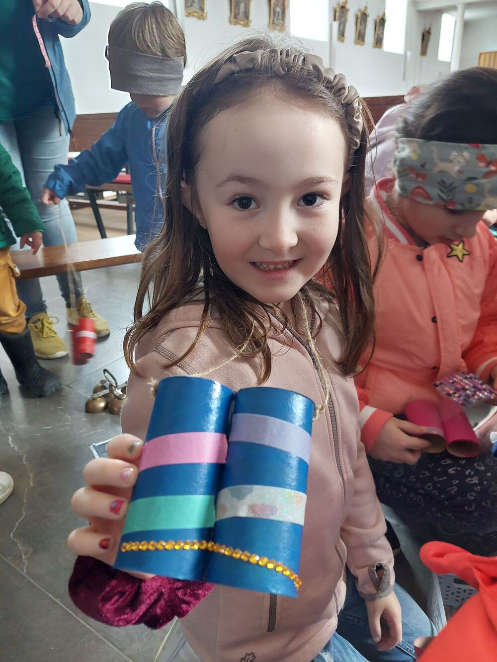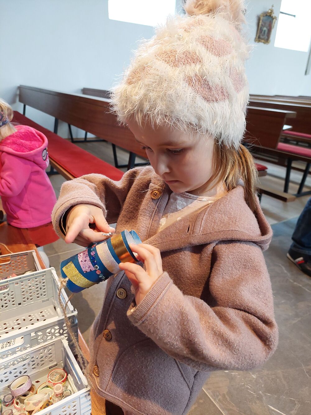 Ein Blick durch das selbstgebastelte Fernrohr und dann ging es los auf Entdeckungstour durch die Kirche. In Gruppen besuchten die Kinder die verschiedensten Stationen. Die Sakristei wurde von Dietmar Hirschbühl erklärt, Pfarrer Ratz ließ die Augen beim neuen Taufbecken, der Osterkerze sowie dem Altar strahlen. Sandra stimmte mit den Kindern die Orgel an und mit Anna wurden bei den Opferkerzen Wünsche zu Gott gesendet und den Beichtstuhl begutachtet. Zum Abschluss durften die Erstkommunionskinder noch den Kirchturm erklimmen.