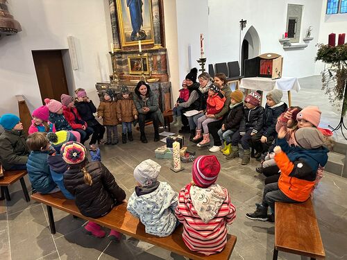 „Wartet! Ich komme!“ Eilig verließ der kleine Stern seinen Himmelsplatz und machte sich auf den Weg. Dieses Licht musste er sich unbedingt ansehen. Vielleicht war es ja wirklich für ihn bestimmt? „Jawohl!“, murmelte der kleine Stern auf seinem Weg erdwärts. „So wird es sein. Sie rufen mich mit ihrem Licht, so wie sie es im letzten Jahr getan haben. Ich glaube, sie feiern wieder ein Fest und erwarten mich.“ Er war sich nun sicher und die Freude in ihm wurde groß und größer, je mehr er sich dem Dorf mit der Kirche, der Lichtertanne und der Krippe näherte. Doch als er in der Kirche ankam, war alles still und dunkel. Auch das wunderhelle Licht war verschwunden. Es herrschte tiefe Nacht und die Menschen, die hier sonst waren, schliefen. Nur bei der Weihnachtskrippe schimmerte schwach das Licht einer Kerze, doch es verlor immer mehr seine Kraft und erlosch schließlich. Dunkel war es geworden. Behutsam glitt der kleine Stern näher und setzte sich auf das Dach des Krippenstalles. Dort blieb er die ganze Nacht und schenkte dem Kind und seinen Eltern, den Tieren und Hirten sein weiches, warmes Licht. Das war gut so und viel festlicher als das allerschönste Fest.